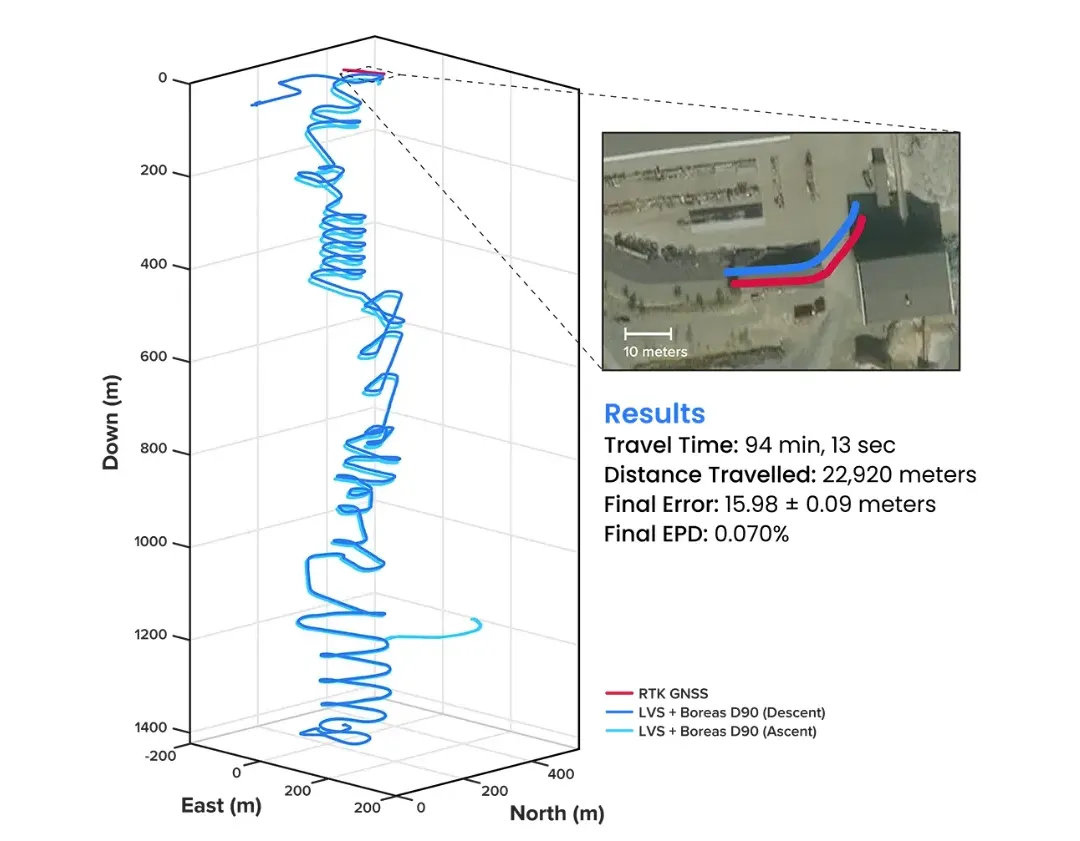 When integrated with Advanced Navigation’s high-performance Boreas D90 INS, the solution achieved a position accuracy of 99.9% of distance traveled. Crucially, this performance was maintained without relying on any fixed positioning infrastructure, pre-existing maps, or external aiding.