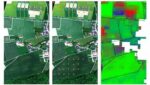 On the left we see a high-resolution HySpex image of the Puch test area in true colors, taken on May 12, 2025. In the center is the same image with locations of drone acquisition points (orange). And on the right, land cover derived from EnMAP satellite data. Pixel colors denote photosynthetically active (“live”) vegetation in
