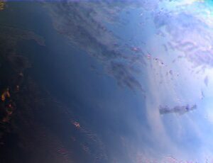 Here we see more detail from those first images. On the top we see a zoomed-in view showing Italy and Greece, with initial processing and corrections. The polarized bottom image clearly shows smoke from fires over Southern Europe, which is far less visible in the natural light image on the top.
