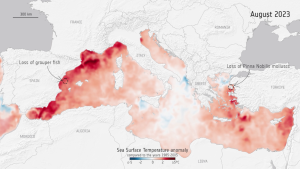 The accompanying image depicts sea-surface temperature anomalies in the Mediterranean Sea for August 2023 relative to 1985-2005 and highlights two cases of biodiversity loss.
